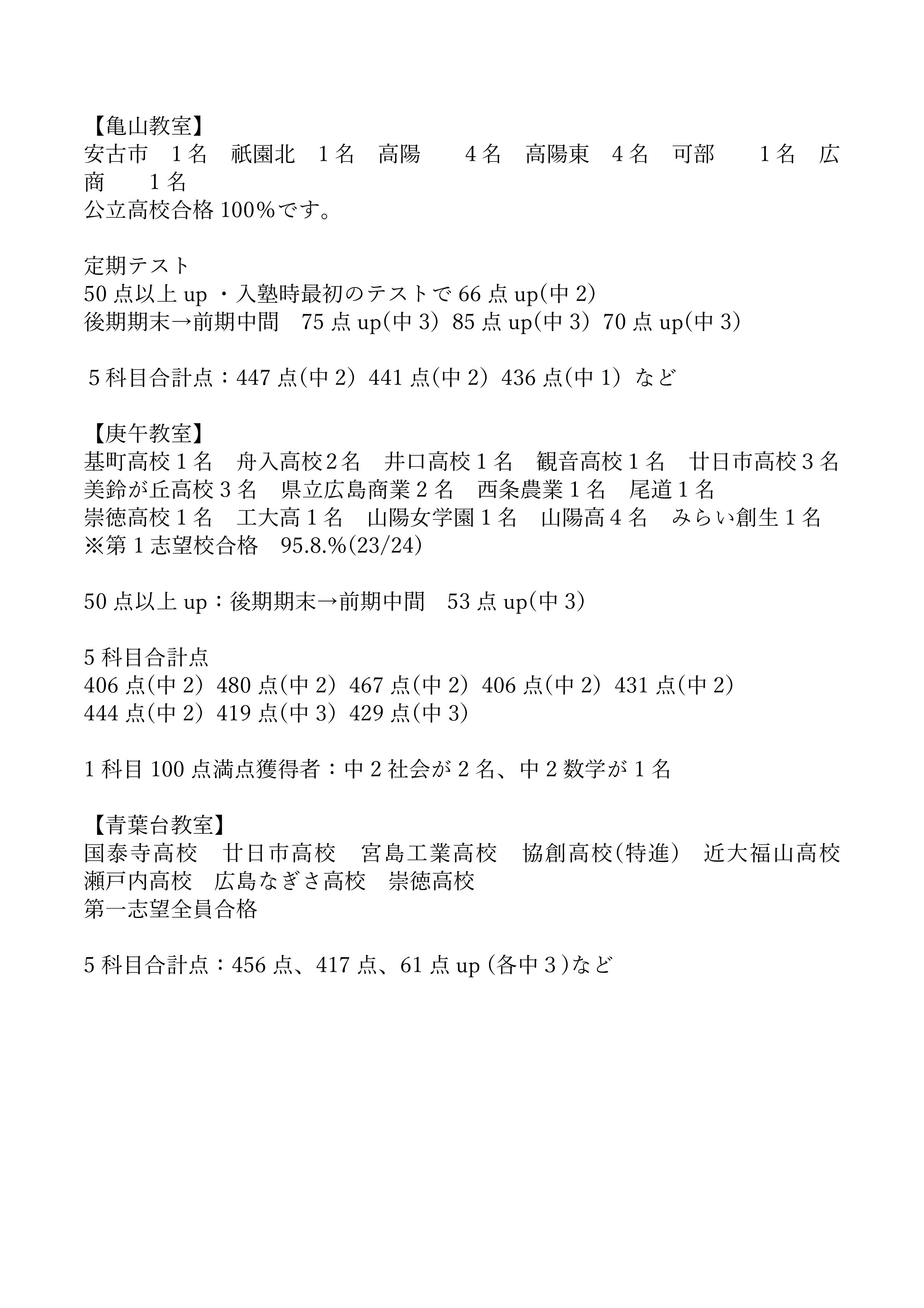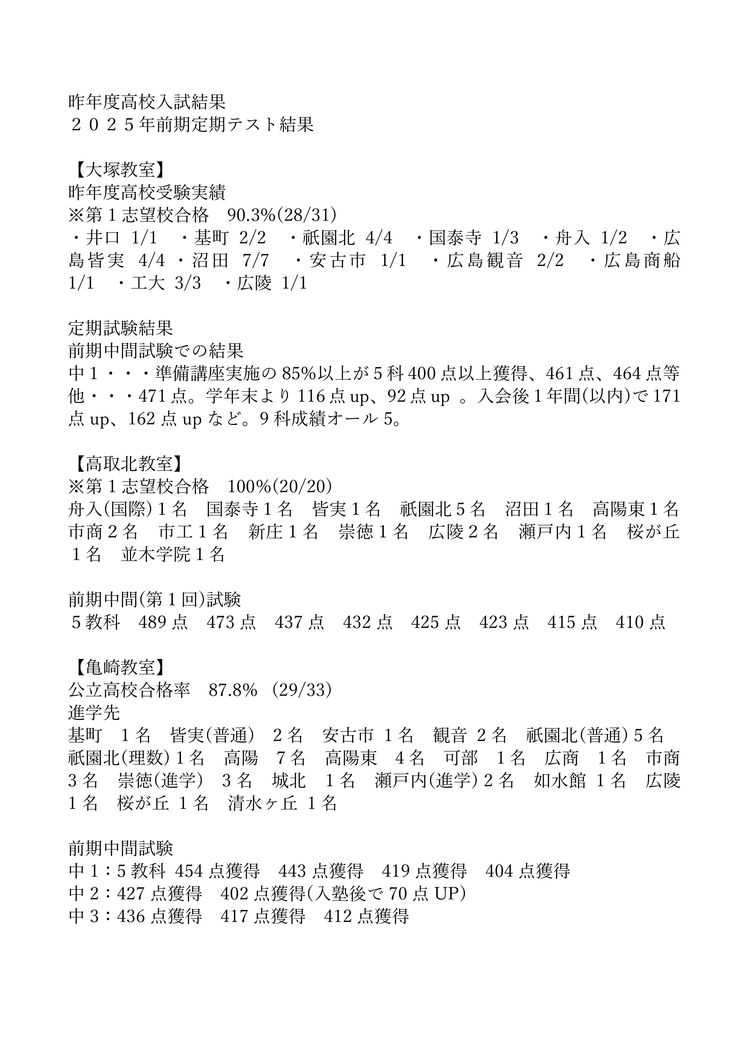 2025年定期テスト結果・昨年度高校入試結果(一部教室別)
